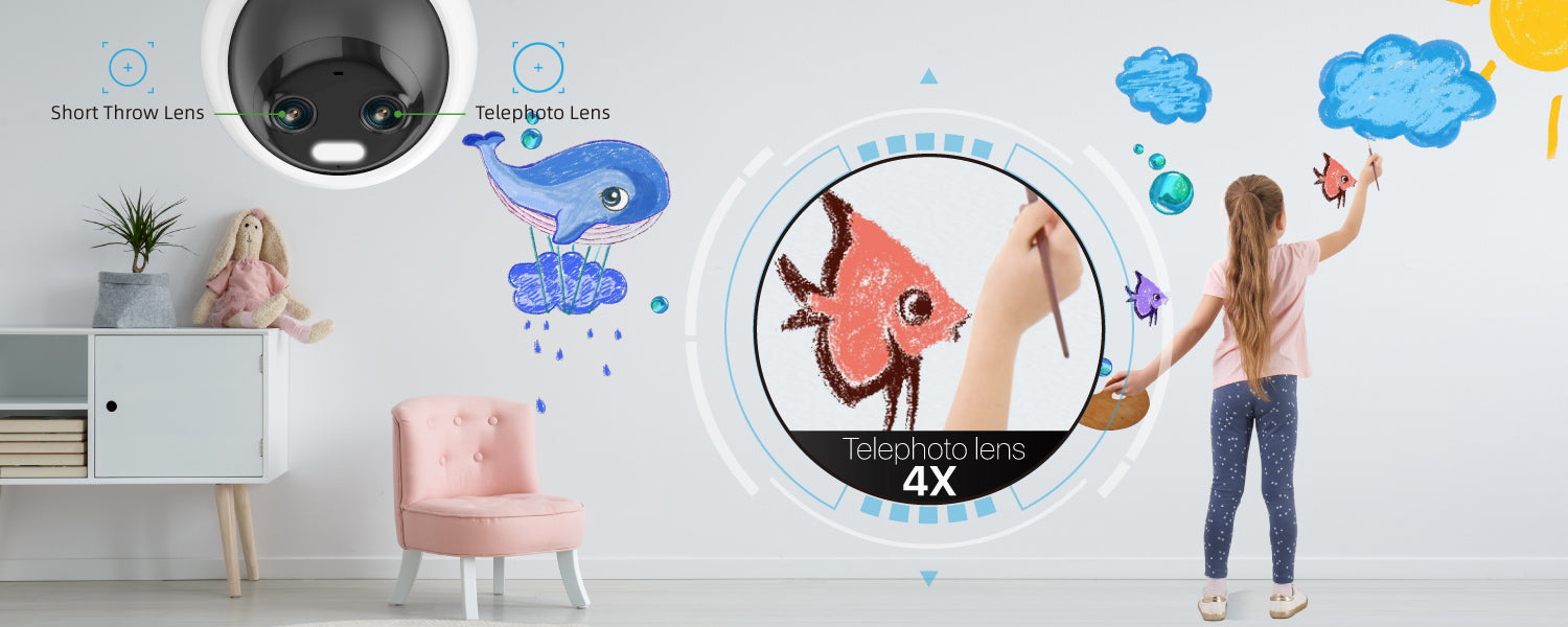 Experience unparalleled coverage with our camera's dual lens feature. Get a broad perspective with the short throw lens and zoom in on distant details with the 4x telephoto lens for comprehensive security.