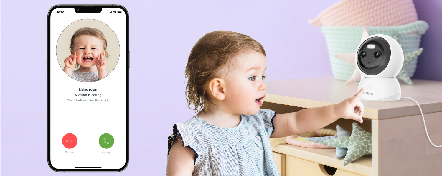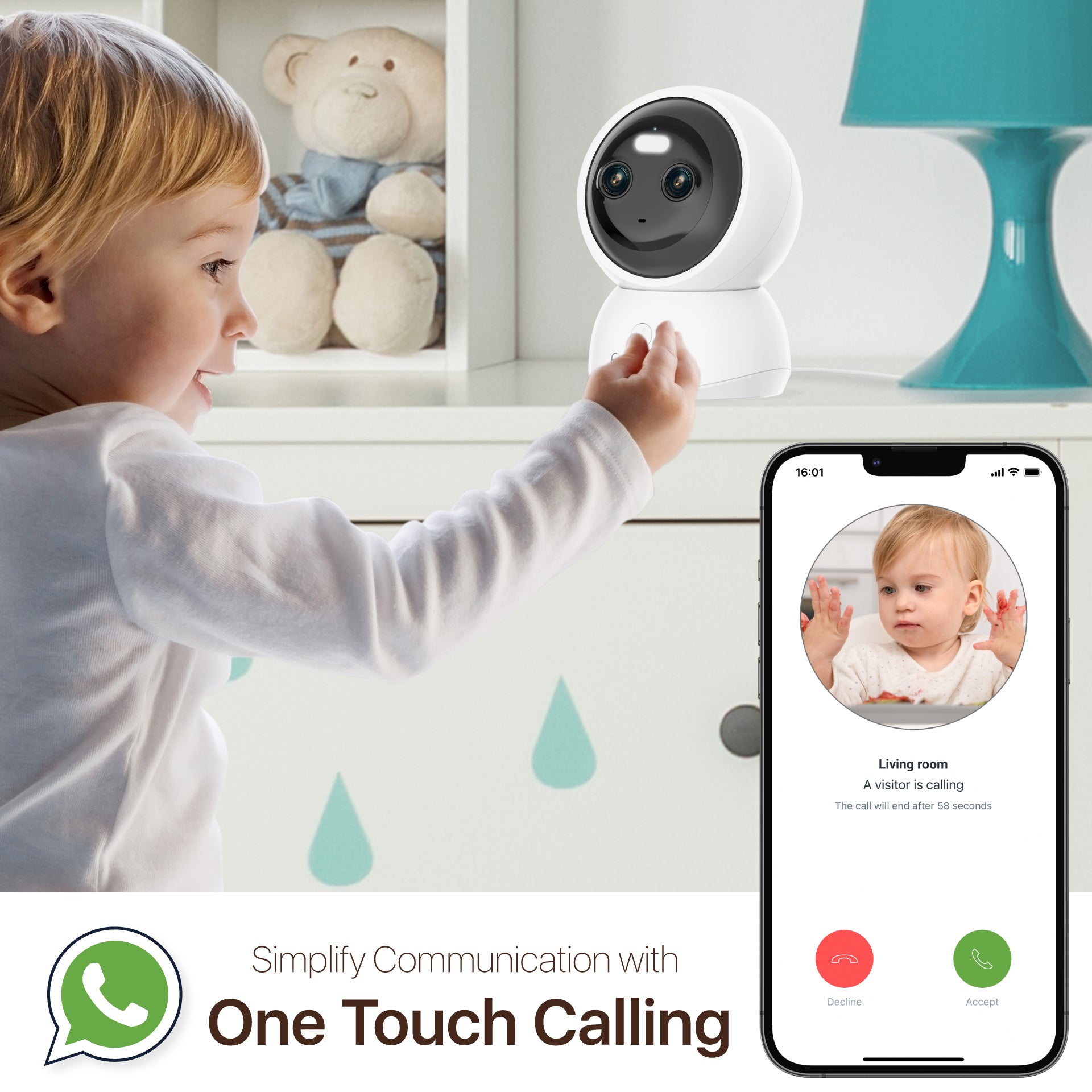 This is our new active calling feature. There's a physical button right under the camera lens. When your child or elderly family member presses it, your app will get a call request—just like they're starting a video call. Accept the call, and you'll see what the camera sees. Easy as pie!